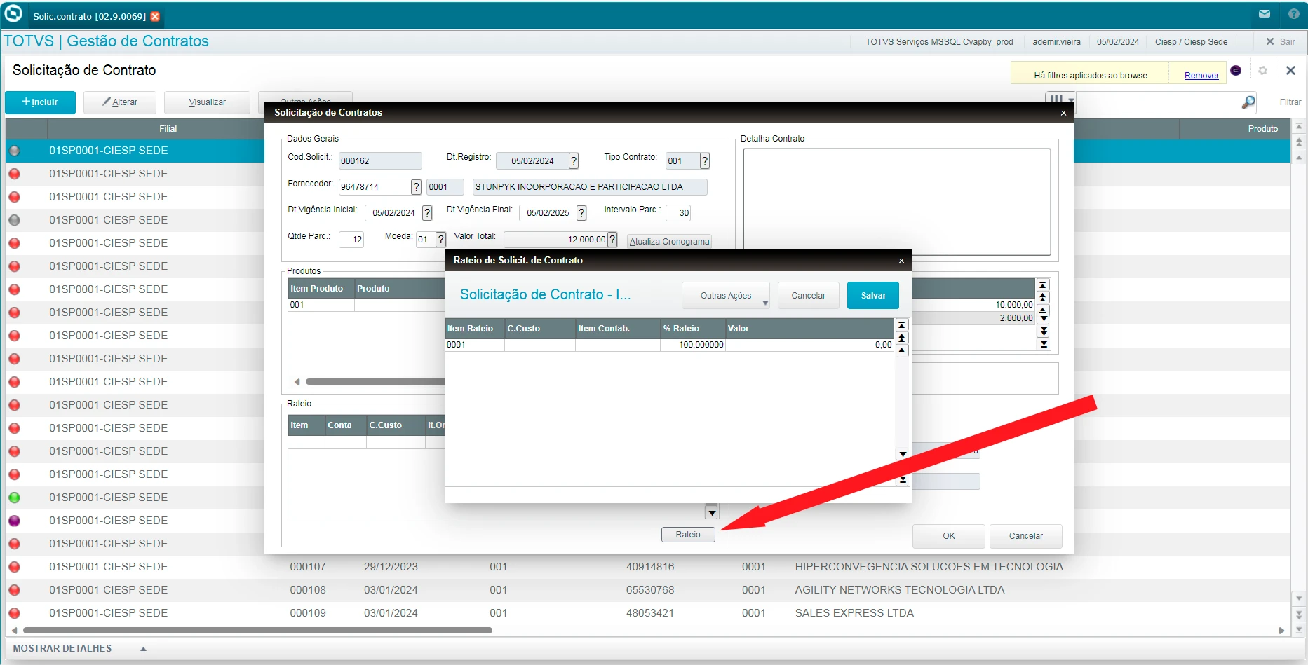 1 - Clicar no botão Rateio
