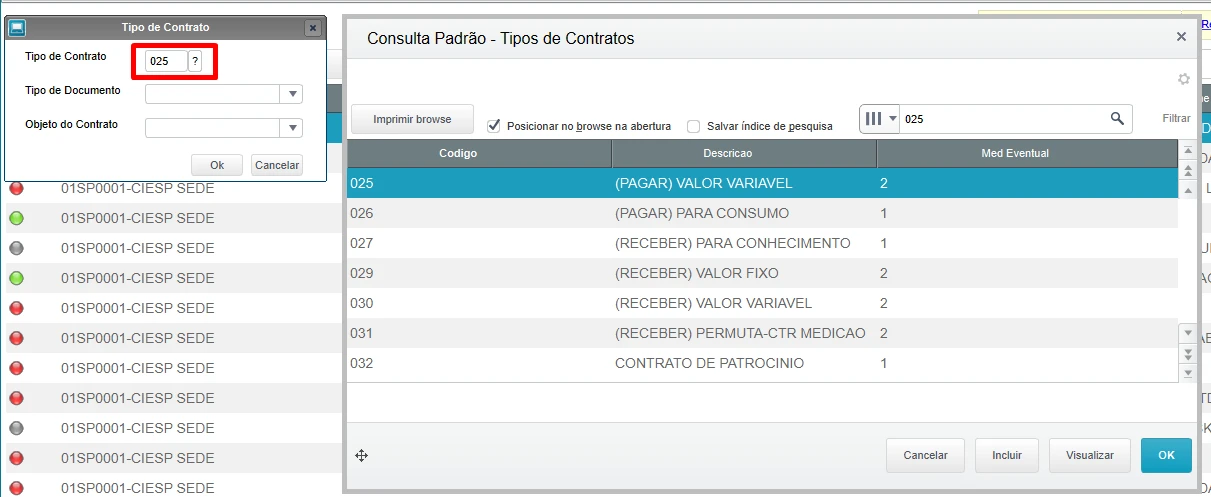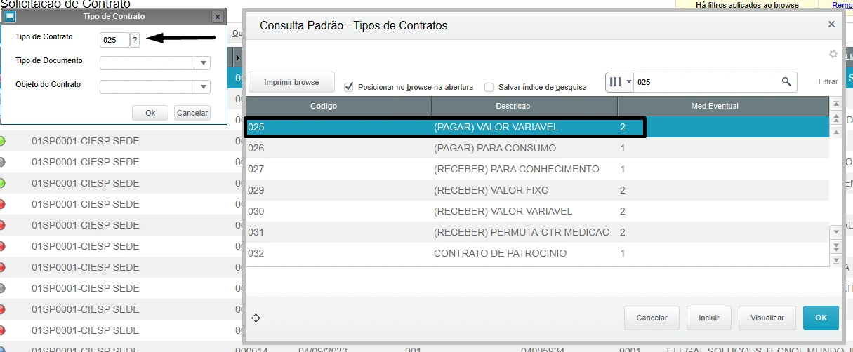 1 - Em Tipo de Contrato escolher 025 - (PAGAR) VALOR VARIÁVEL
