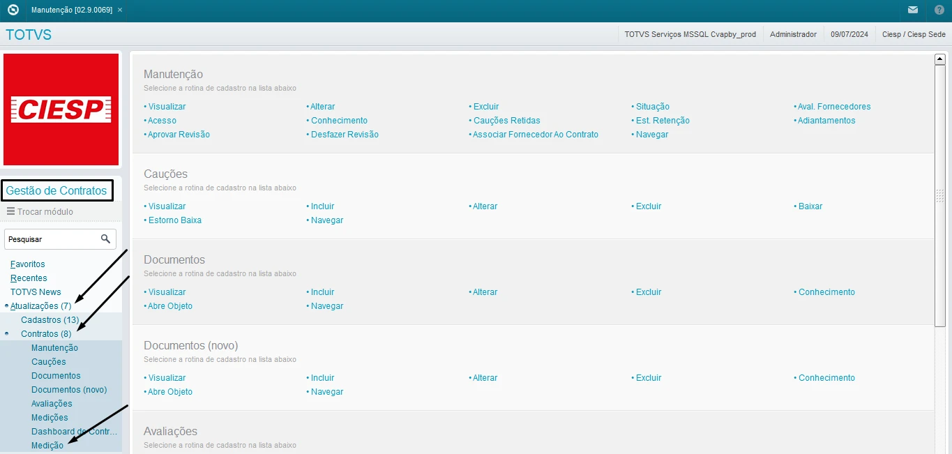 Com o número do contrato, acesse o menu para incluir a Medição de Contratos: