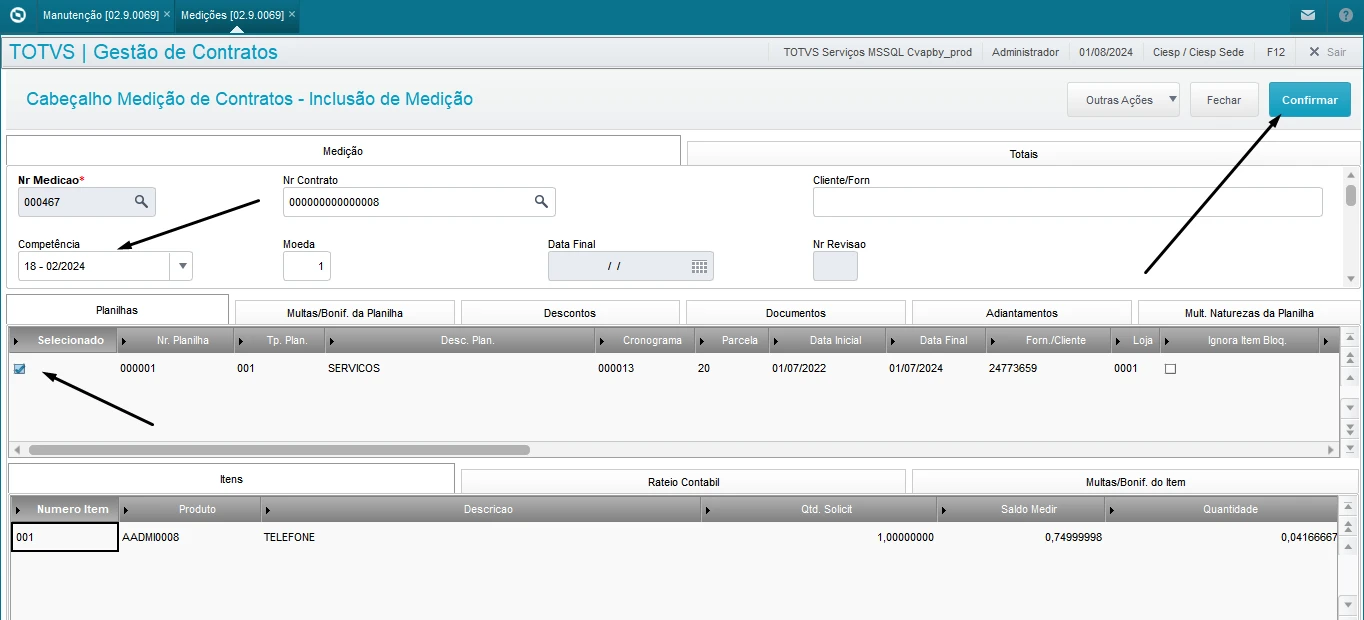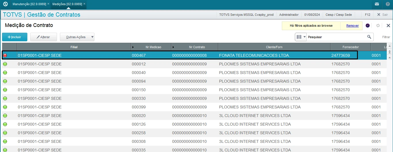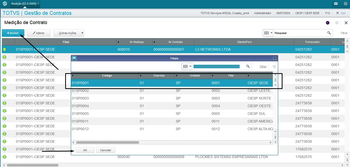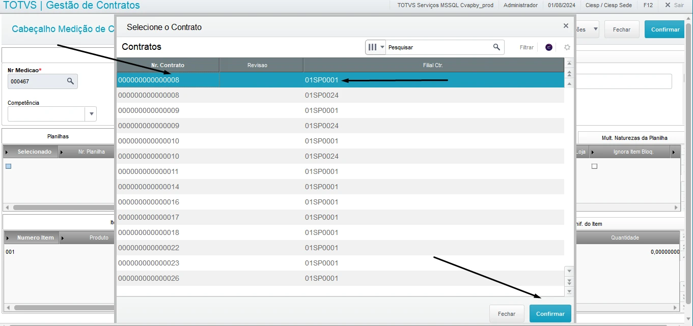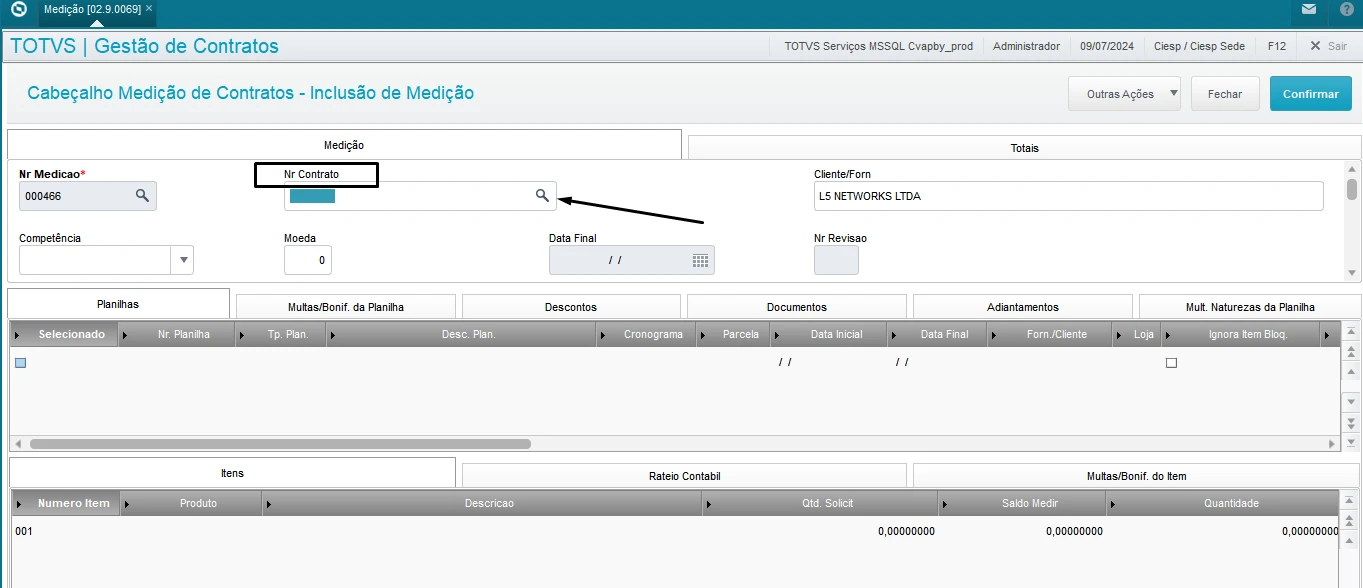 Na tela de Incluir Medição, cliquem em Nr Contrato: