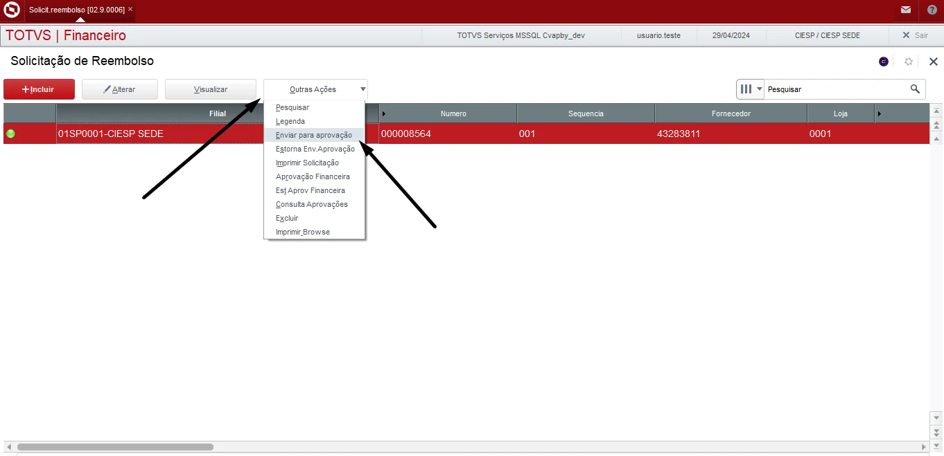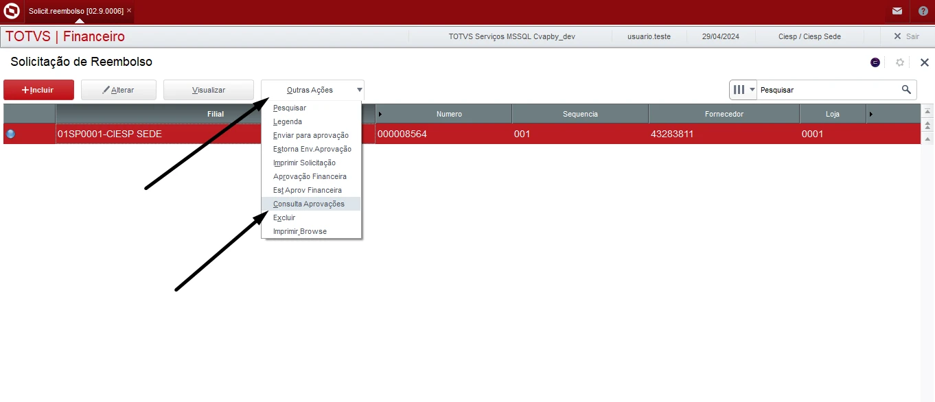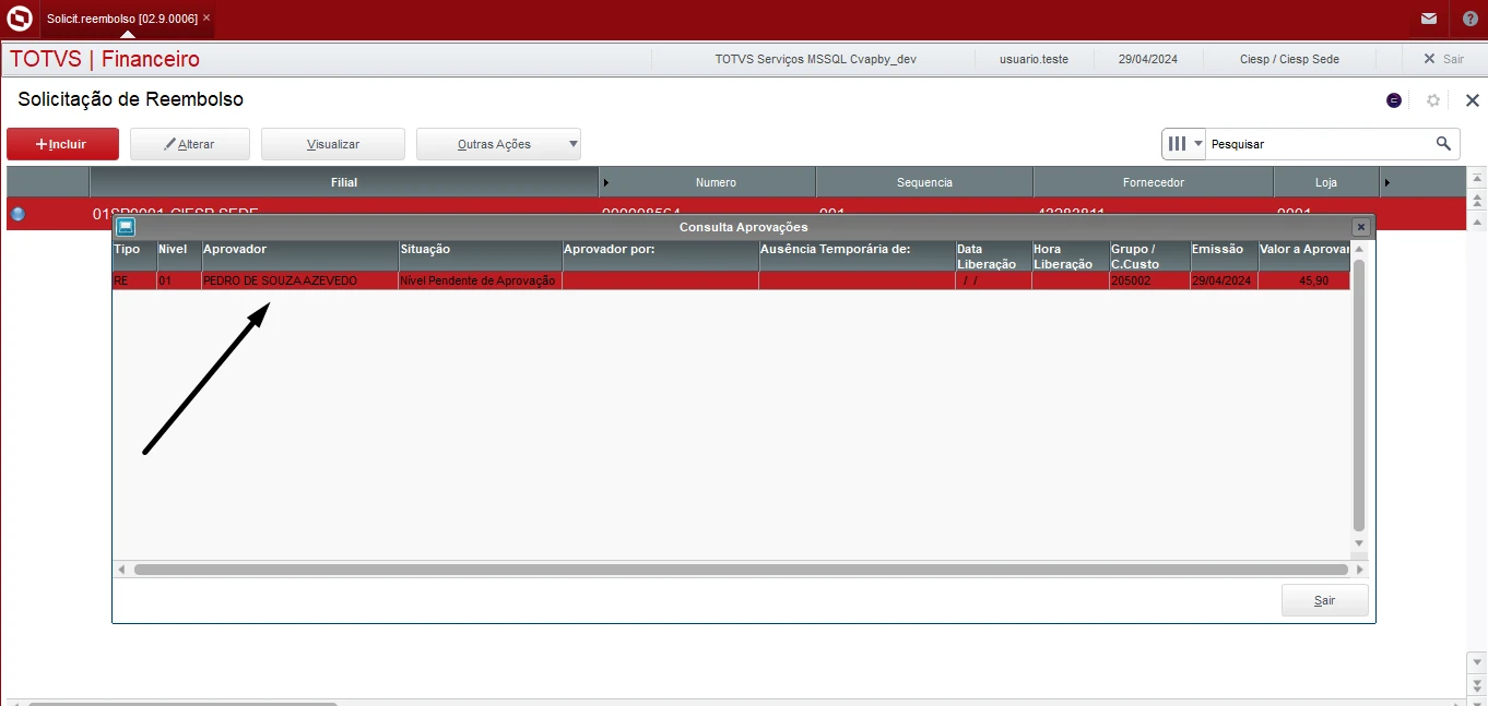 O Protheus vai exibir quem é o usuário que deve aprovar a solicitacao: