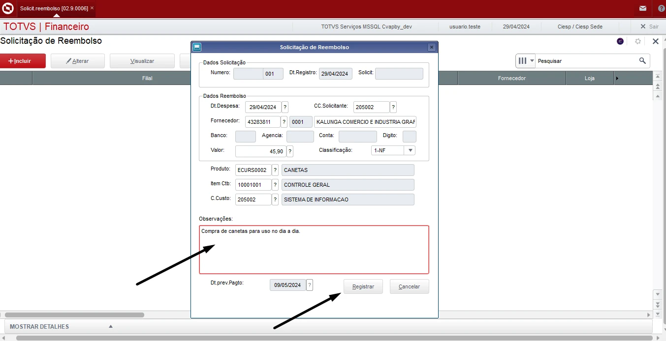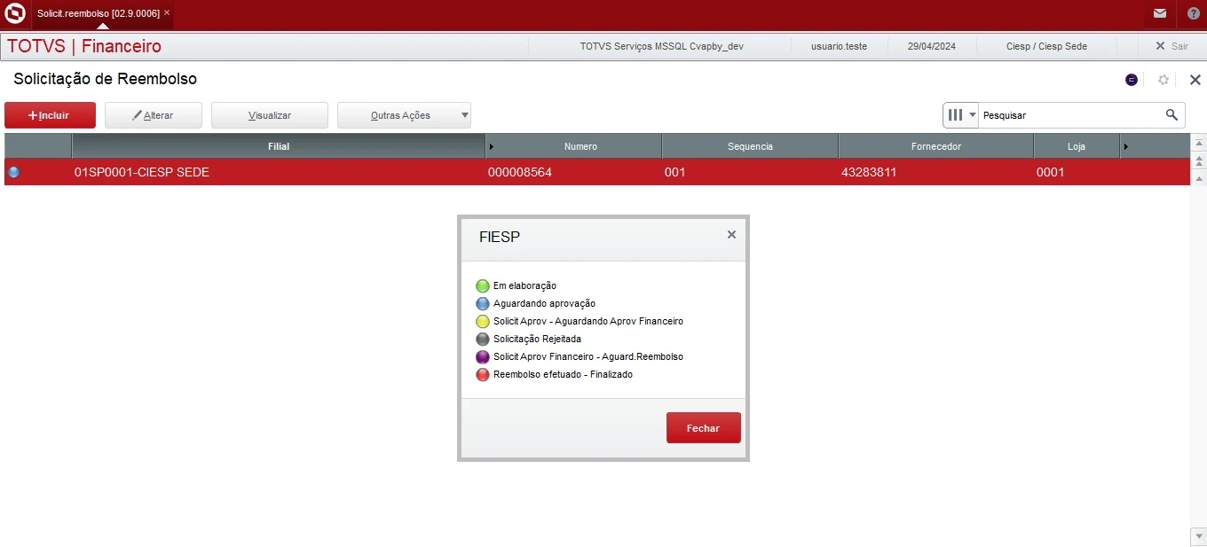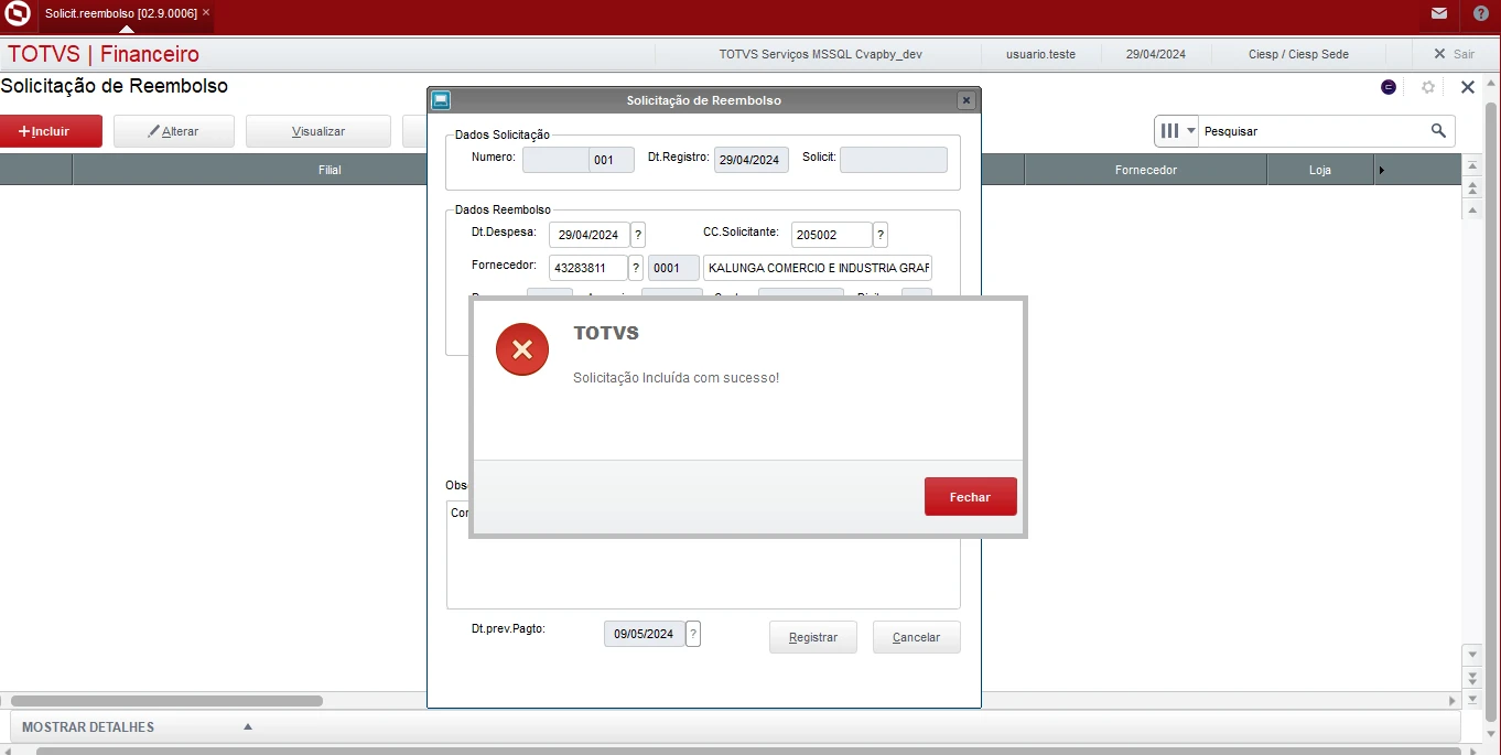 Após seguir as etapas anteriores a Solicitação é incluída no Protheus: