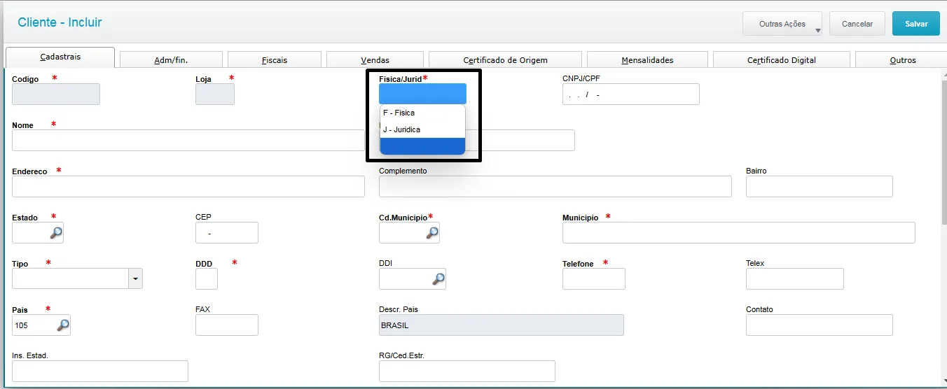 Na tela abaixo, preencha apena os campos que possuem o asterisco *