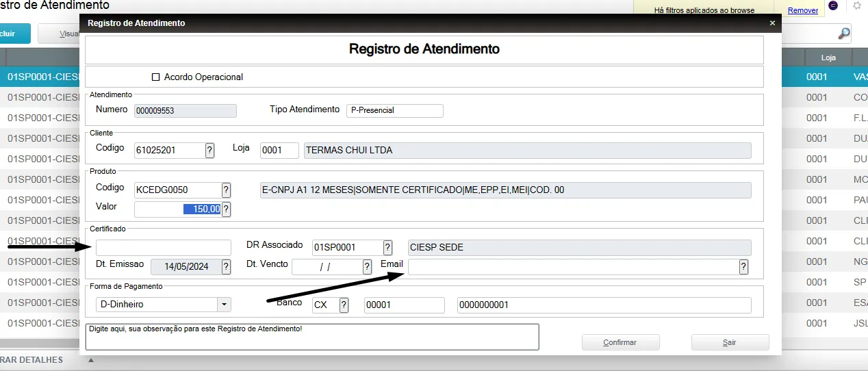 No campo e-mail, sempre inserir o e-mail do cliente;