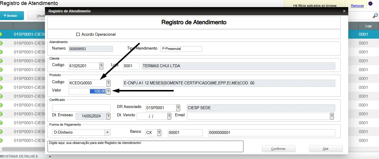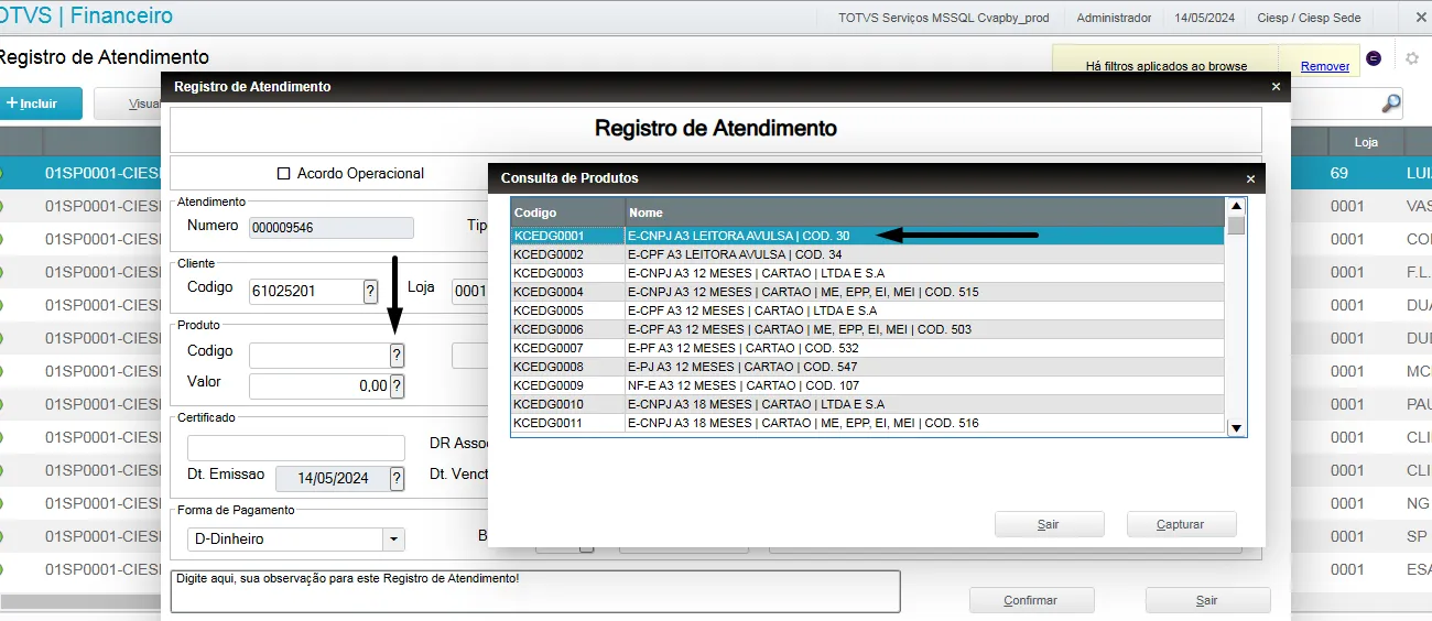 Escolha sempre o produto correto ao qual está vendendo ao cliente. Cadastrar o atendimento com o produto incorreto poderá acarretar em pagamentos indevidos entre as partes;