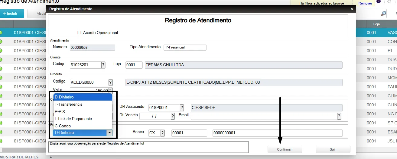 No campo Forma de Pagamento selecione as opções escolhidas pelo cliente durante o atendimento;