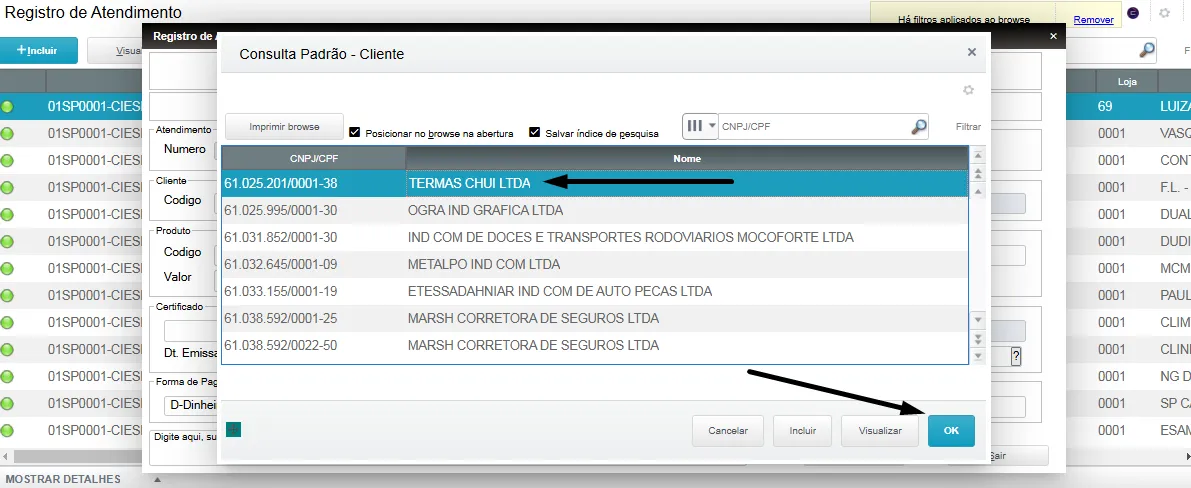 Dê um duplo clique na Razão Social ou nome do cliente que deseja cadastrar o Registro de Atendimento;