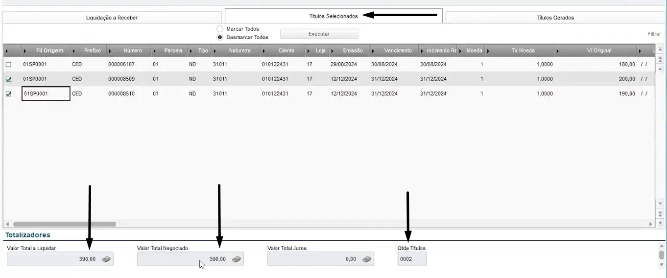 c) Confira os valores apresentados no rodapé para garantir que os títulos corretos foram selecionados.