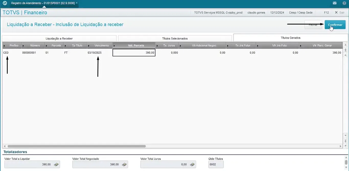 Após clicar em "Liquidar", você será direcionado ao menu onde ocorre a unificação dos valores das notas.